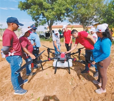 在巴西北里奥格兰德州联邦教育科技学院阿波迪校区农场,巴西师生和农户学习操作中国生产的无人机。迪奥任塞·诺夫雷加摄