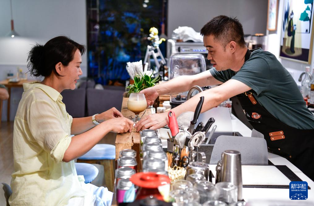 “黑石咖啡”主理人雷鸣(右)为顾客介绍一款创意咖啡(2025年6月23日摄)。新华社记者 杨文斌 摄