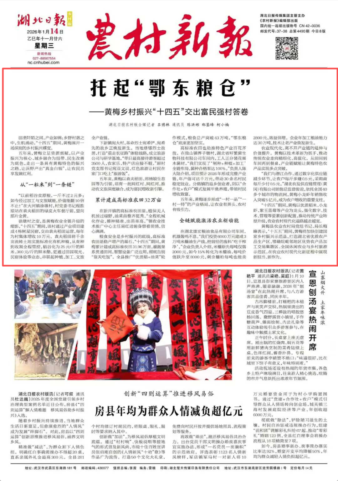 1月14日,湖北日报·农村新报头版头条报道黄梅:《托起“鄂东粮仓”——黄梅乡村振兴“十四五”交出富民强村答卷》。