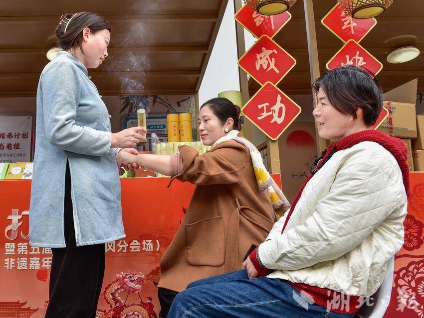 1月16日黄冈分会场活动已率先启幕。蕲春县剧团献上专场演出,以精品戏曲搭配趣味有奖互动,热情邀约四方宾朋赴蕲春旅游购物。现场,蕲春艾灸疗法、管窑手工制陶技艺、李时珍药酒配制技艺、麦芽糖制作技艺四项非遗同台展演,精湛的传统技艺与浓郁乡土气息的年货产品相互映衬,打造出一场可看、可玩、可购的新春文旅盛宴,持续擦亮蕲春非遗文旅名片。