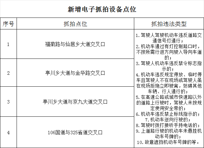 自2026年2月9日起在麻城市区域内的部分路口、路段新增启用电子警察交通违法抓拍系统,针对驾驶人驾驶机动车违反道路交通信号灯通行、违反禁令标志、违反禁止标线指示、逆向行驶、不按导向行驶等交通违法行为,进行自动抓拍并依法处理。