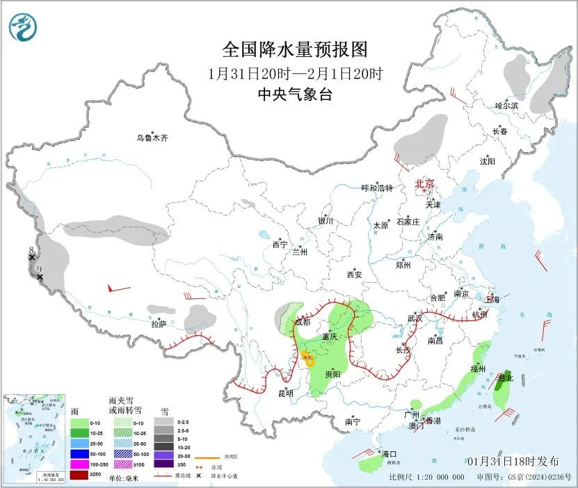 中央气象台预计,1月31日20时至2月1日20时,内蒙古东部、黑龙江中部和东部、新疆南疆西部山区、西藏西部和北部、川西高原北部等地部分地区有小到中雪或雨夹雪。