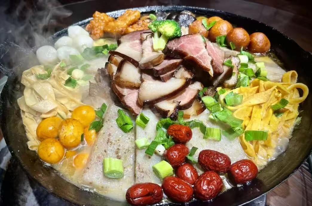铜吊锅挂在伸缩铁钩上,咕嘟冒泡。锅内,腊肉、土鸡、野笋、鱼面、鱼丸等挨挨挤挤,全是本地“土味”。游客们围炉而坐,筷子起落,鲜香味儿飘满屋。