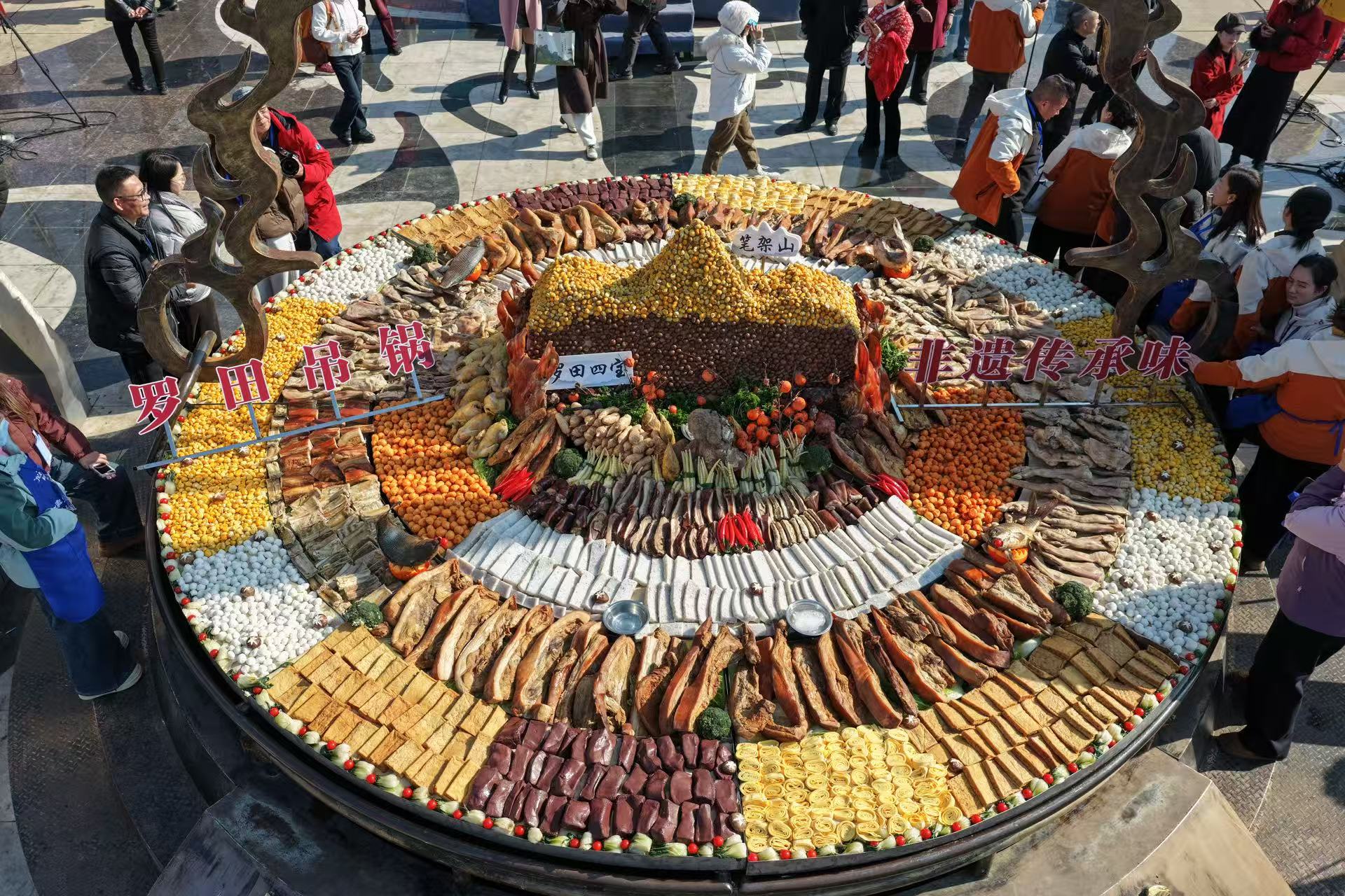 2、天下第一吊锅:2015年1月24日,湖北罗田县余三胜广场展出一座直径5米、高3.5米的铜制吊锅,经上海大世界基尼斯中心认证为"天下第一吊锅"。该吊锅由鄂东名厨陈柏槐团队制作,使用板栗、土鸡等300余种食材,总重达3吨,可供数百人同时食用。活动吸引近万名游客参与,成为当地文化旅游推广的重要节点。2023年第五届罗田吊锅节期间,该吊锅再度展出,并持续推动农旅融合发展 。