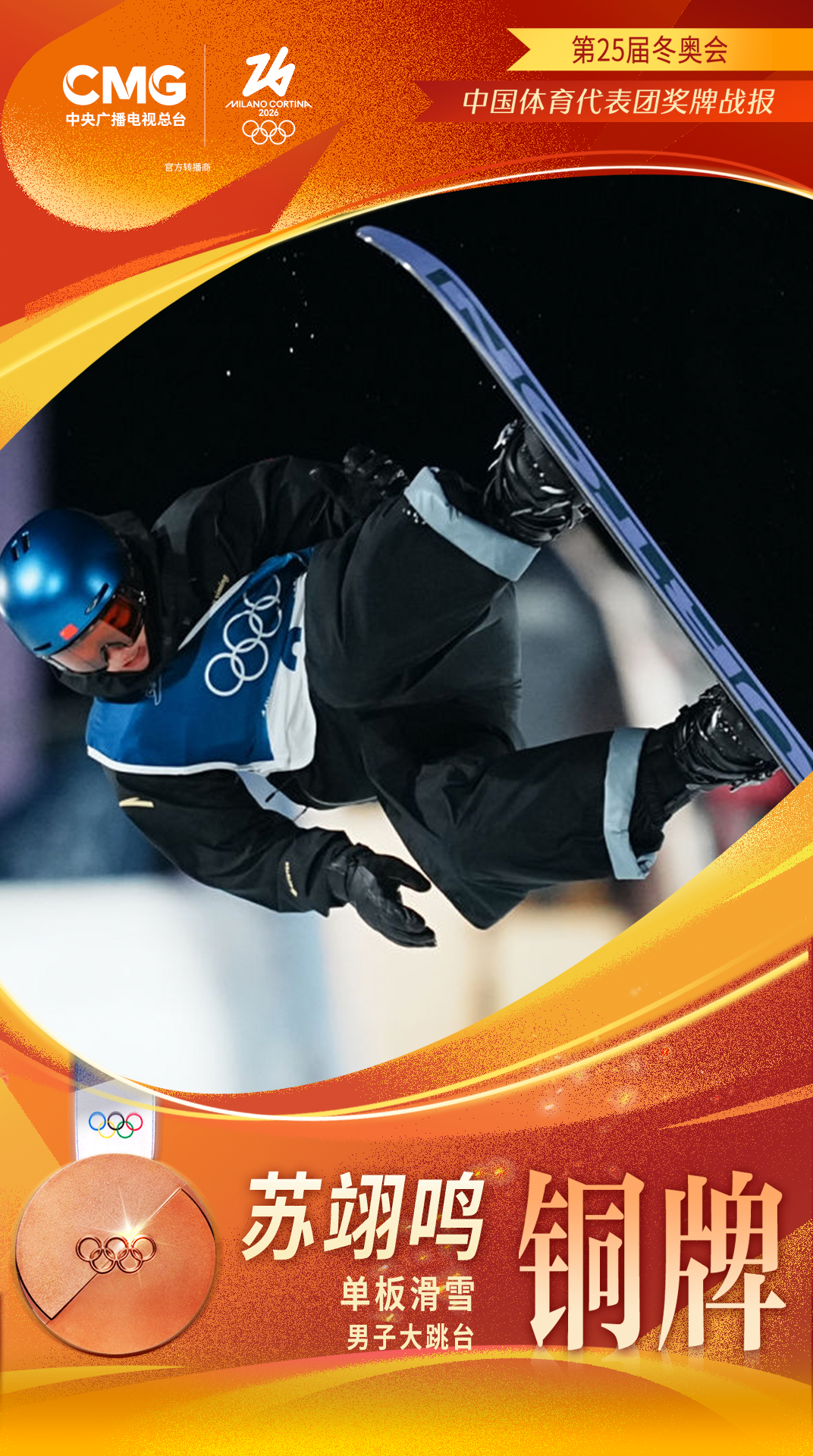 北京时间8日,米兰-科尔蒂纳冬奥会单板滑雪男子大跳台决赛,苏翊鸣获得铜牌,这是中国体育代表团在本届冬奥会获得的首枚奖牌。