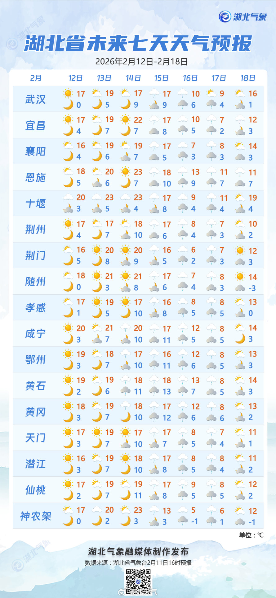 2月13日08时-14日08时,江汉平原南部、鄂东南、鄂东北东部多云到阴天有短时小雨;其他地区多云。最高气温17~22℃,最低气温西部3~7℃、中东部7~11℃,偏南风2到3级。