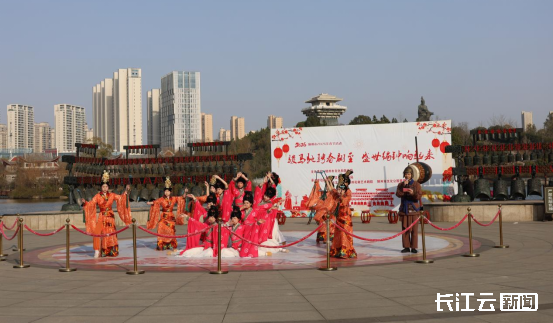 当天15:00,广场上的编钟演奏正迎来观赏高潮,乐师们正专注地敲击着青铜编钟,雄浑的钟声穿越千年时空,在春日的空气中久久回荡。舞台上,沉浸式古风演绎也正同步进行,演员们身着传统服饰翩然起舞,水袖轻扬间生动再现着古代礼乐的盛世风华,将先秦时期的曾国礼乐文化鲜活地呈现在观众眼前。现场观众或驻足凝神聆听,或拿出手机记录下这震撼的瞬间,每个人都在沉浸式触摸历史文脉,感受传统礼乐的独特魅力。