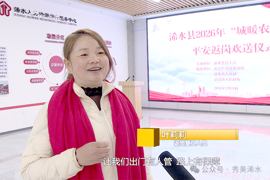 返岗复工人员 叶莉莉:每年春节买票难、出行难,都是我们最头疼和发愁的事情,为了解决我们的后顾之忧,今年县里特地把服务送到了家门口,让我们出门有人管,路上有保障,安安全全地去上班,踏踏实实地去工作,这份实实在在的关心,我们都记在心里非常感谢。