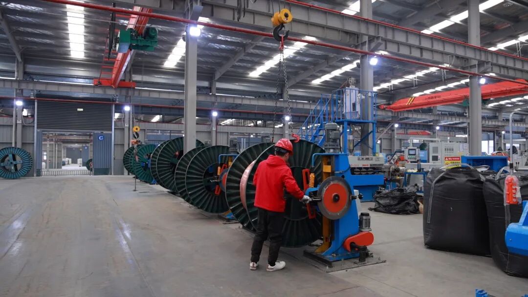 走进生产车间,一股热浪扑面而来,机器轰鸣声此起彼伏。百米长的生产线上,工人们分工协作、紧张有序,叉车来回穿梭运送着成盘的电缆,行吊在空中平稳滑行,精准地将原材料送达指定工位。整个车间忙而不乱,处处涌动着蓬勃的生产活力。