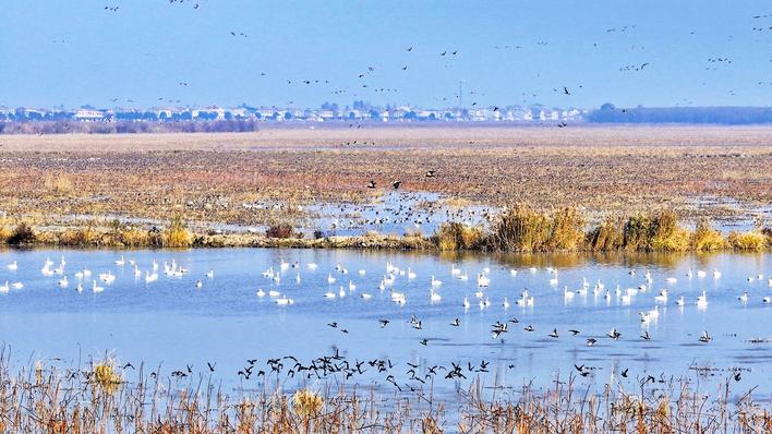 洪湖湿地保护区内,成群候鸟或觅食休憩、或展翅飞翔。 (张灿 摄)