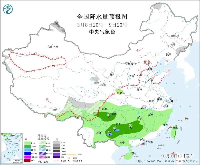 中央气象台预计,8日20时至9日20时,新疆西部山区和北疆北部、西藏东南部、川西高原北部、青海东北部、黑龙江西北部、吉林东部等地部分地区有小雪或雨夹雪,其中,新疆北疆北部等地部分地区有中到大雪;江南大部、西南地区东部和南部、华南西部和北部、海南岛、台湾岛等地部分地区有小到中雨,其中,四川南部、贵州南部、广西北部等地部分地区有大雨。