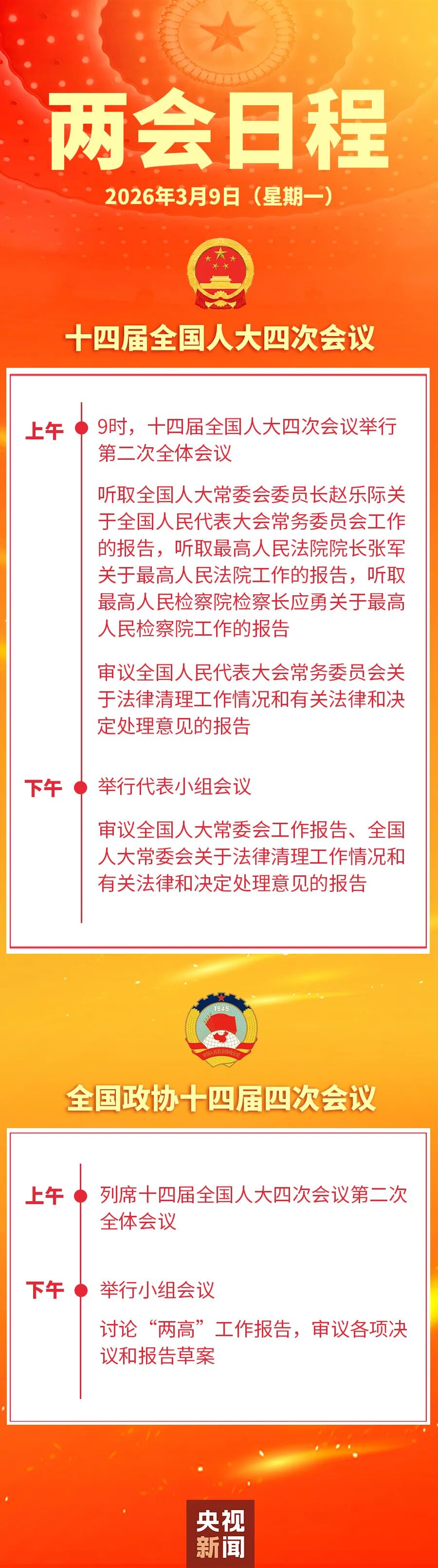 今天(3月9日)上午9时,十四届全国人大四次会议第二次全体会议将在人民大会堂举行,听取全国人大常委会工作报告和“两高”工作报告。