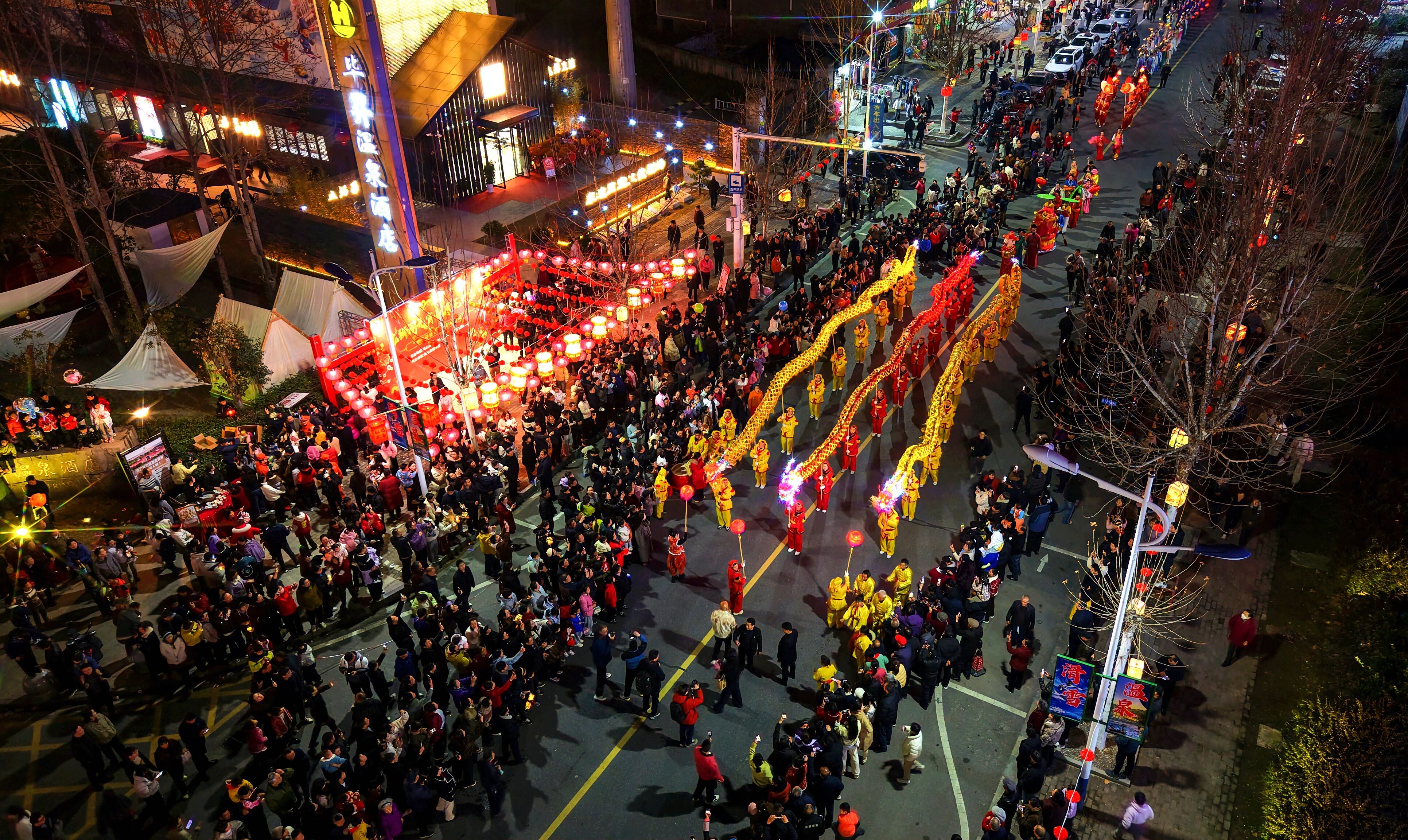 而当夜幕降临,另一番温暖景象徐徐展开。洪广毕昇温泉度假村里,“马上来财 事事毕昇”新年发财游园会人头攒动,热气蒸腾的汤池洗去一身疲惫;艾利圣月悟温泉的“2026新春音乐会”旋律悠扬,让身心在泉水与音乐中得到双重慰藉。