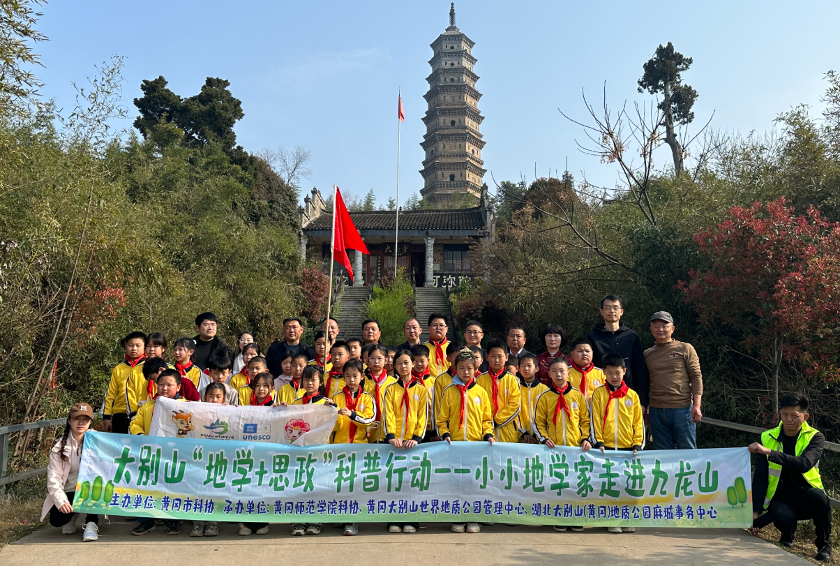 3月25日,由黄冈师范学院科学技术协会主办,黄冈大别山世界地质公园、麻城市自然资源和规划局、麻城市科学技术协会联合承办的黄冈大别山世界地质公园"地学+思政"科普行动在九龙山园区顺利开展,近50名师生参与活动。活动以自然教育和地学科普为核心,依托九龙山红层地貌、千年古塔与古柏群落等优质资源,通过实地观察、现场讲解、互动体验,将自然教育、地学科普与思政育人有机融合,为青少年带来一堂"行走的思政课"与"沉浸式科普课",引导青少年亲近自然、读懂家乡、崇尚科学、守护遗产。