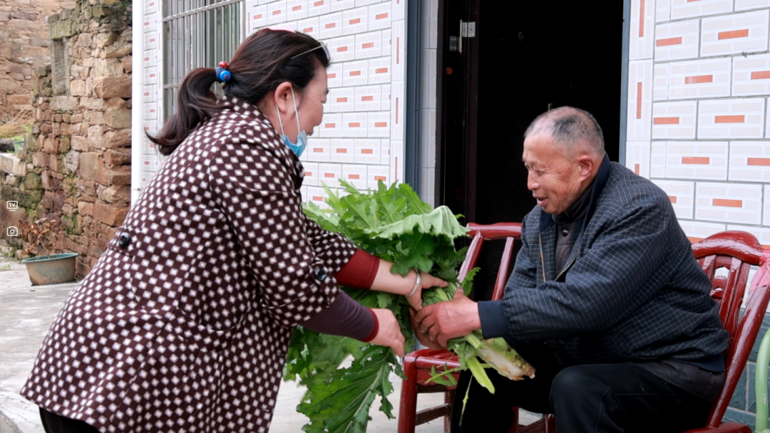 红安县觅儿寺镇神登山村村民王荷英说:“我虽然也60多岁了,但比起他们老人我还是个年轻人。他们的后辈都不在家里,有时老人一个人在屋里,我就去串下门,说说话,送点吃的给他们,以孝为先。”