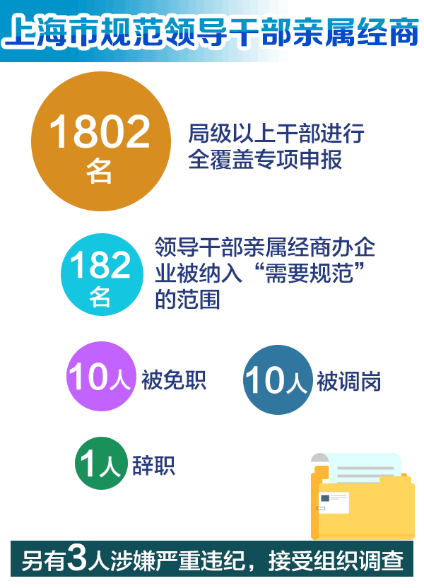 一、禁止 领导干部配偶、子女及其配偶违规经商 红线 对不如实报告或者未及时纠正的,按照有关规定给予领导干部组织处理或者纪律处分。涉嫌违法的,移送有关机关处理。 ——上海《关于进一步规范本市领导干部配偶、子女及其配偶经商办企业行为的规定(试行)》 成效 规范领导干部配偶、子女违规经商,整治领导干部“身边人腐败”,群众有期待,中央也早就盯上了。具体怎么做?2015年2月,中央深改组第十次会议将试点首次选定在上海。试行一年来,上海严查领导干部亲属经商办企业,共甄别出165名市管干部需要规范,目前已全部完成规范工作。其中,112人亲属退出经商办企业活动,10人调整现任职务,10人免职退休,1人辞去现任职务,另有3人被立案调查。
