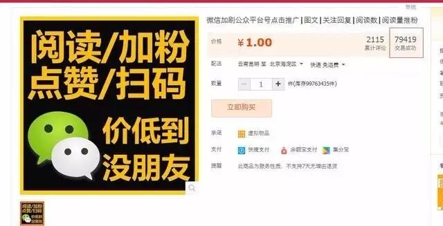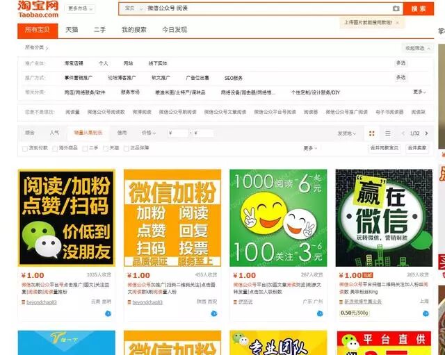 不信你去某宝搜“微信公众号 阅读”,商家数量多达几十页,有的店家交易量已经达到了数万笔。